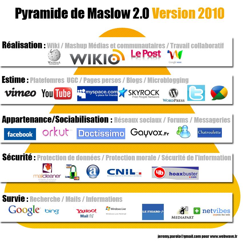 J’ai déniché sur le Web la pyramide de Maslow version 2.o. Il est fascinant de voir l’actualisation de cette théorie à notre ère technologique et d’en comprendre les ramifications qui permettent de mieux catégoriser le comportement des navigateurs sur le Web.