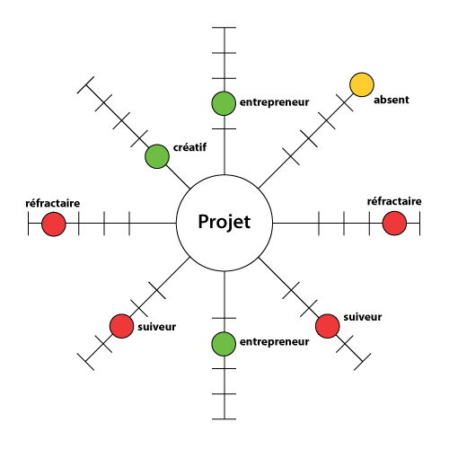 La ou le gestionnaire de projet doit être conscient de ces forces et avoir le talent de les utiliser au mieux. Grâce à son intuition et ses habiletés sociales, il ou elle a le pouvoir d’amener un ou des acteurs à changer de position sur l’axe de participation afin de contribuer plus positivement au projet créatif. Un bon ou une bonne gestionnaire de projet sera capable d’installer et de maintenir l’ambiance de travail nécessaire aux participants pour qu’ils déploient leur potentiel et saura décoder leurs besoins. Ainsi, il ou elle comprendra mieux les enjeux de pouvoir entre les forces visionnaires des créatifs et les forces de résistance des réfractaires ce qui lui permettra d’en tirer profit dans l’atteinte de l’objectif du projet.
